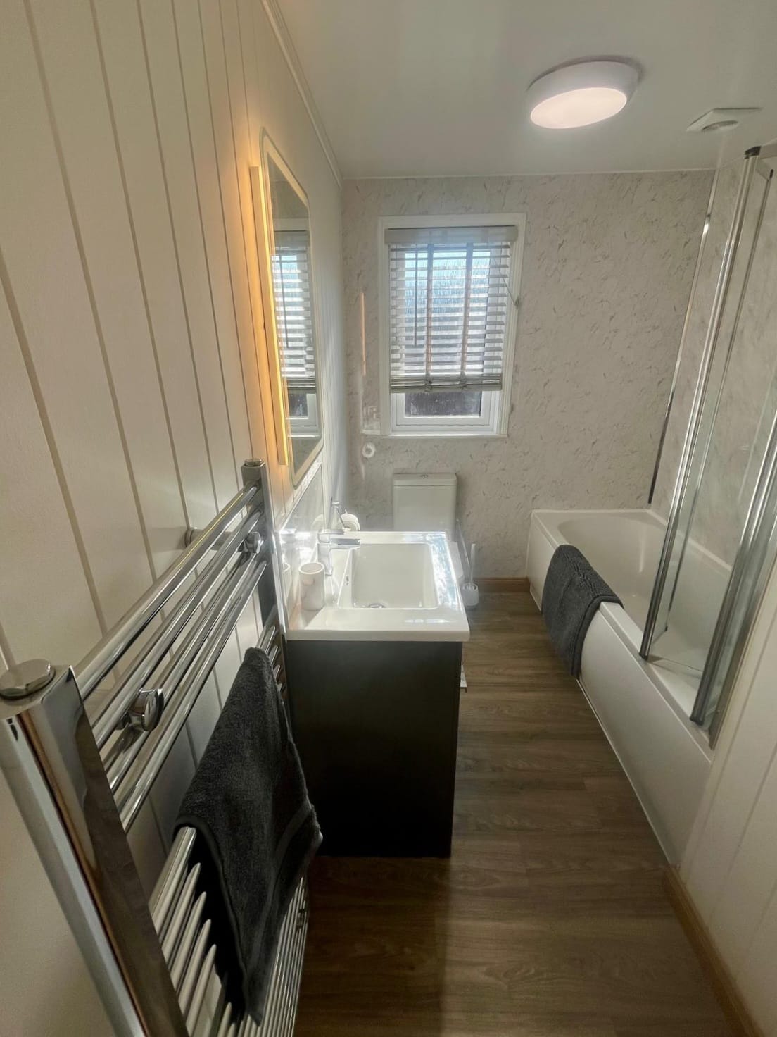 - Main bathroom with bath and shower over
